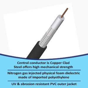 - Central conductor is made of 99.97 % pure solid copper manufactured in house. It is insulated with Nitrogen gas injected physical foam dielectric manufactured from imported polyethylene, which enhances the foaming upto 70%, which leads to lower and uniform attenuation.